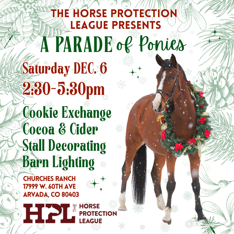 Please join The Horse Protection League on Saturday, December 6 for “A Parade of Ponies”. The event will be held at the Ranch from 2:30 to 5:30 PM. Don’t miss your chance to support HPL and join the herd in celebrating the magic of the season. (If the weather doesn’t cooperate, it will be held the following Saturday.)